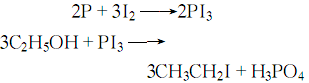 3.由乙醇與三碘反應(yīng)而得紅磷。操作過程為:將乙醇和紅磷置于反應(yīng)瓶中,在水浴上加熱回流,慢慢加入碘顆粒,繼續(xù)回流。然后將反應(yīng)液蒸干,得黃色粗品,再經(jīng)洗滌、干燥、過濾,即得成品。